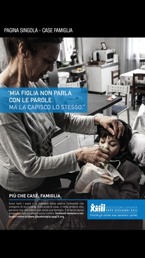 Si tratta di un progetto che mi è stato affidato da Id.eas, società di consulenza in marketing e comunicazione – https://www.instagram.com/id.eas_srl/ – per il loro cliente l’Associazione Papa Giovanni XXIII – https://www.apg23.org/ – : un’associazione internazionale fondata nel 1968 da don Oreste Benzi impegnata per contrastare l’emarginazione e la povertà: una comunità fatta di 500 realtà di condivisione tra case famiglia, mense per i poveri, centri di accoglienza, comunità terapeutiche, Capanne di Betlemme per i senzatetto, famiglie aperte e case di preghiera.